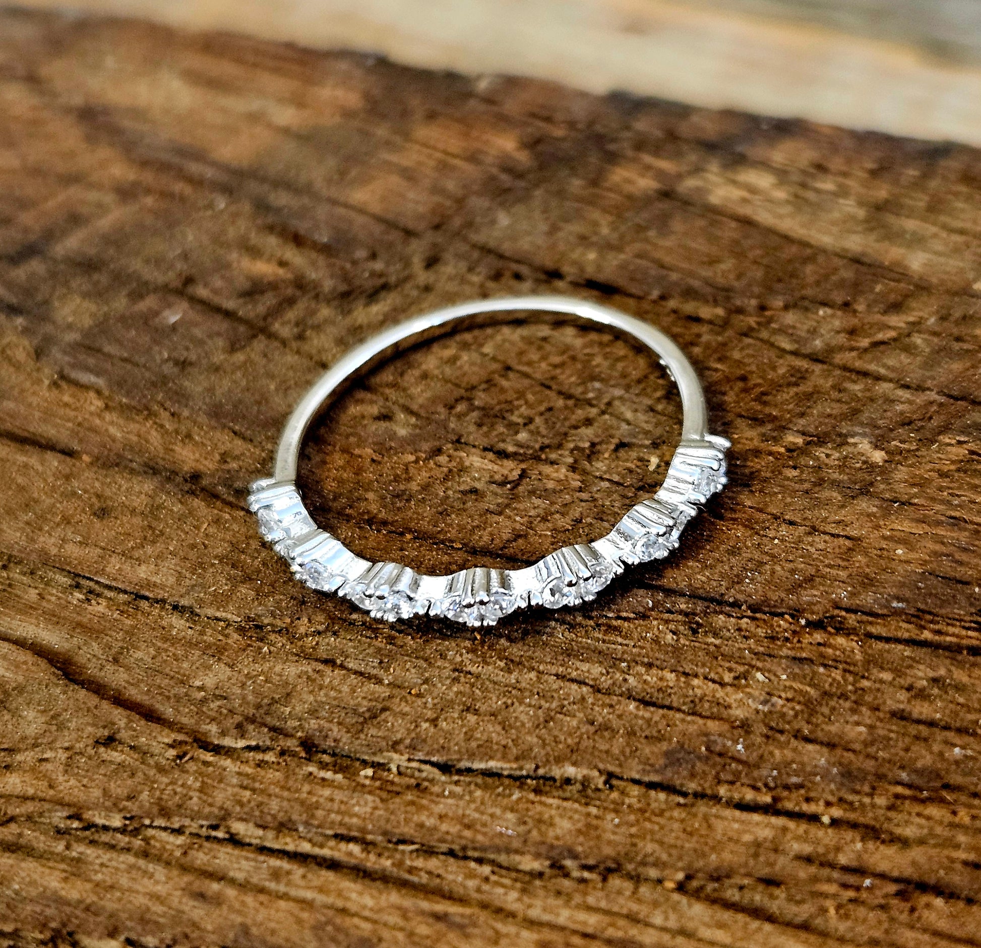 Elevate your stack game with this half eternity sterling silver band! Its shimmering stones wrap halfway around, adding just the right amount of sparkle without stealing the spotlight. Perfect for mixing and matching. Wear it solo or stack it up for endless style.