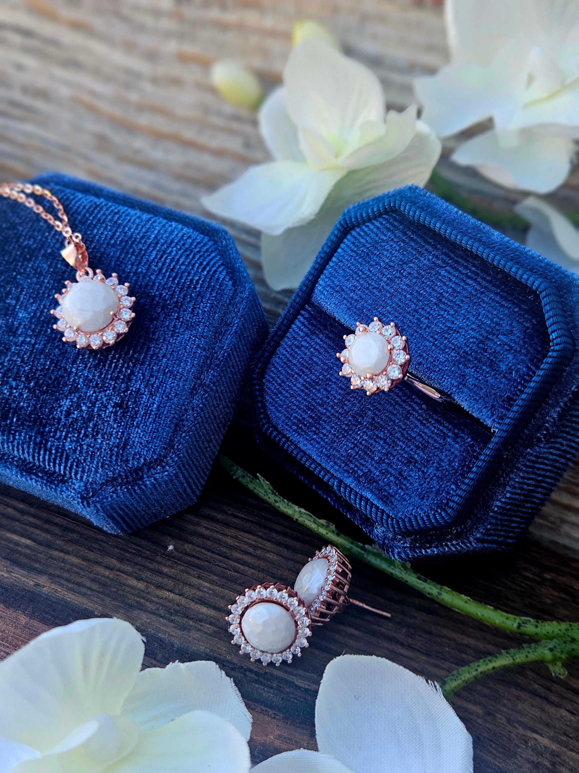 Available in sterling silver or rose gold plated. Enjoy the necklace, ring, and beautiful earrings!