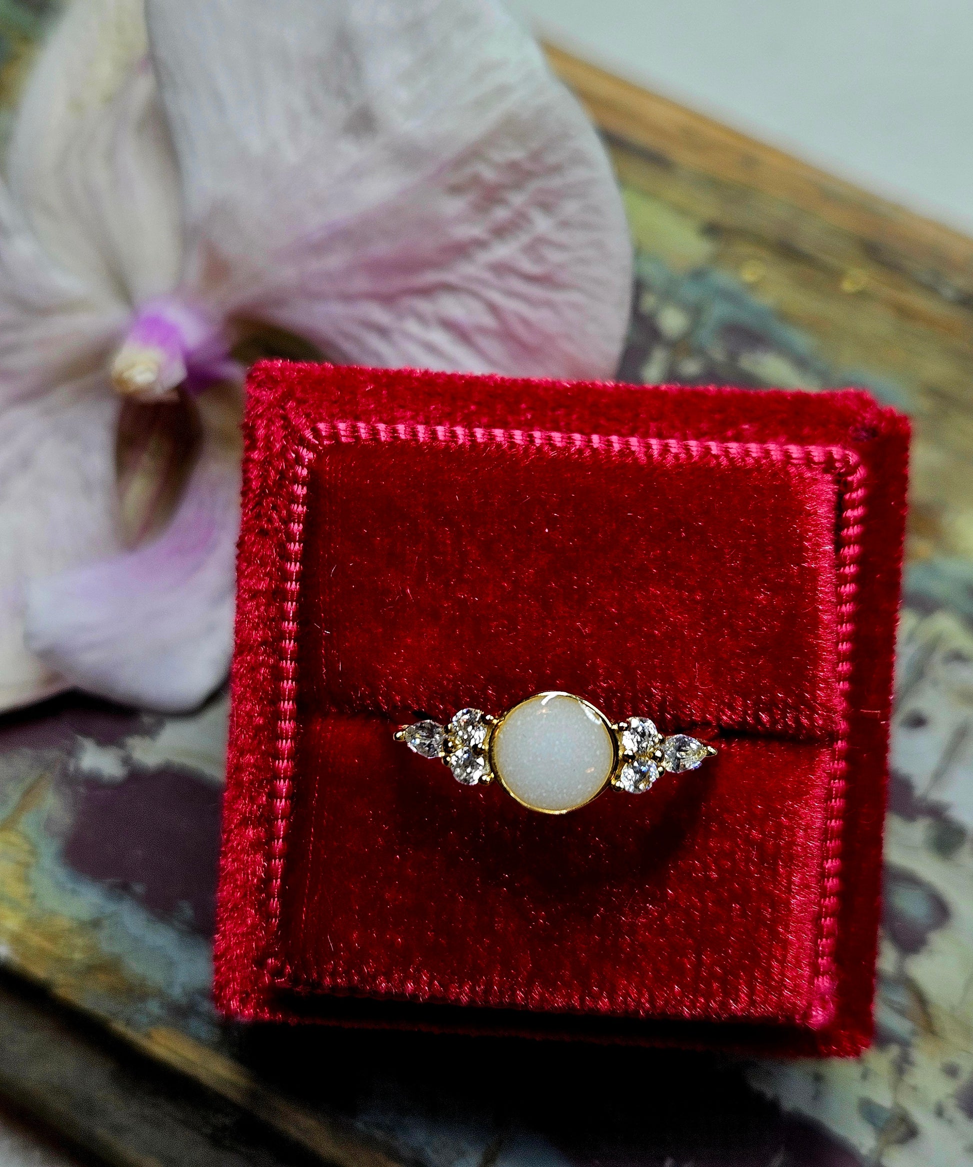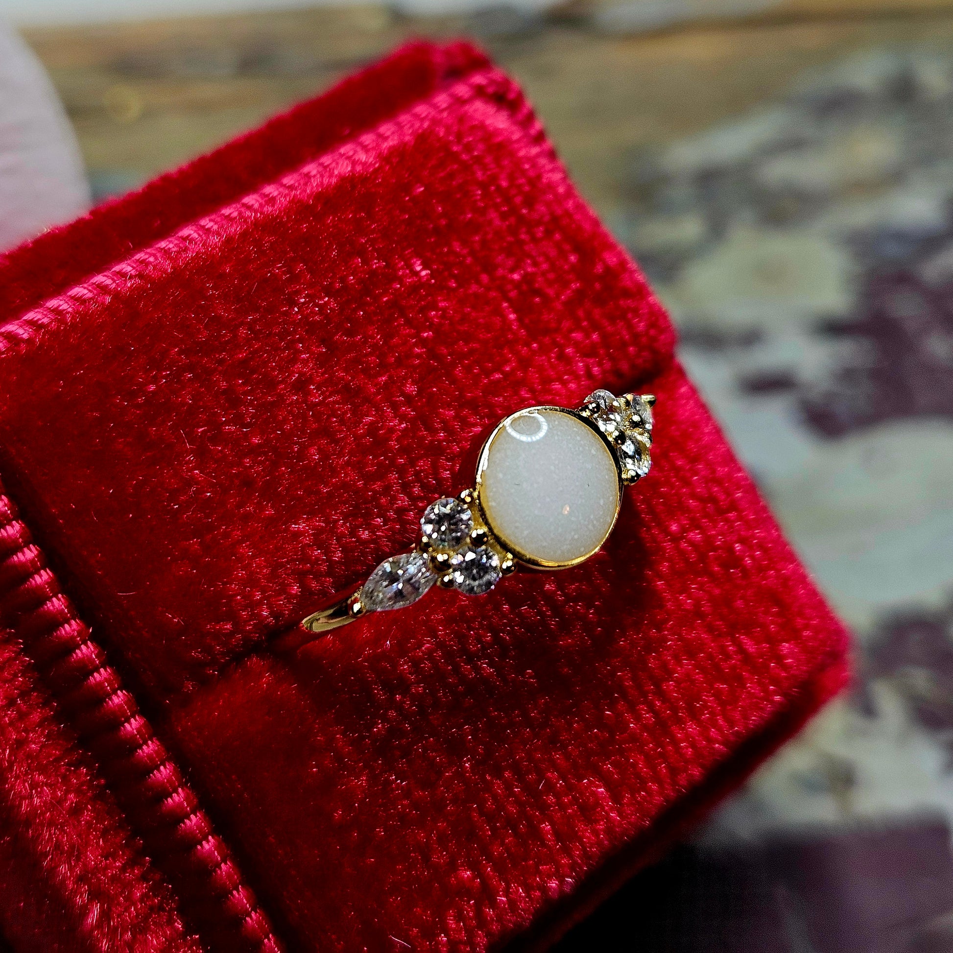 Shine bright like the stars with our Celestial Circle Ring. With a dazzling 6mm round stone surrounded by sparkling CZ stones, this ring is available in stunning sterling silver or luxurious rose or yellow gold plated.