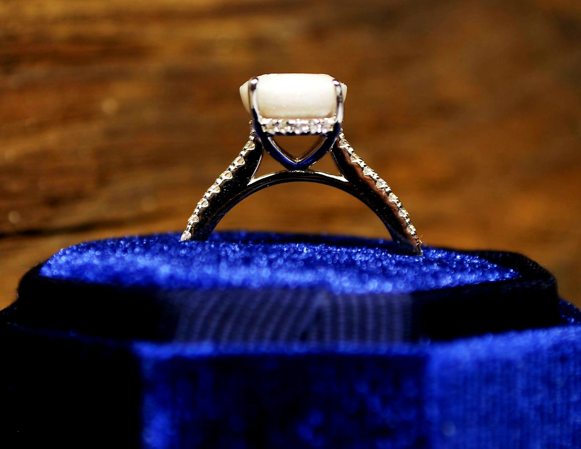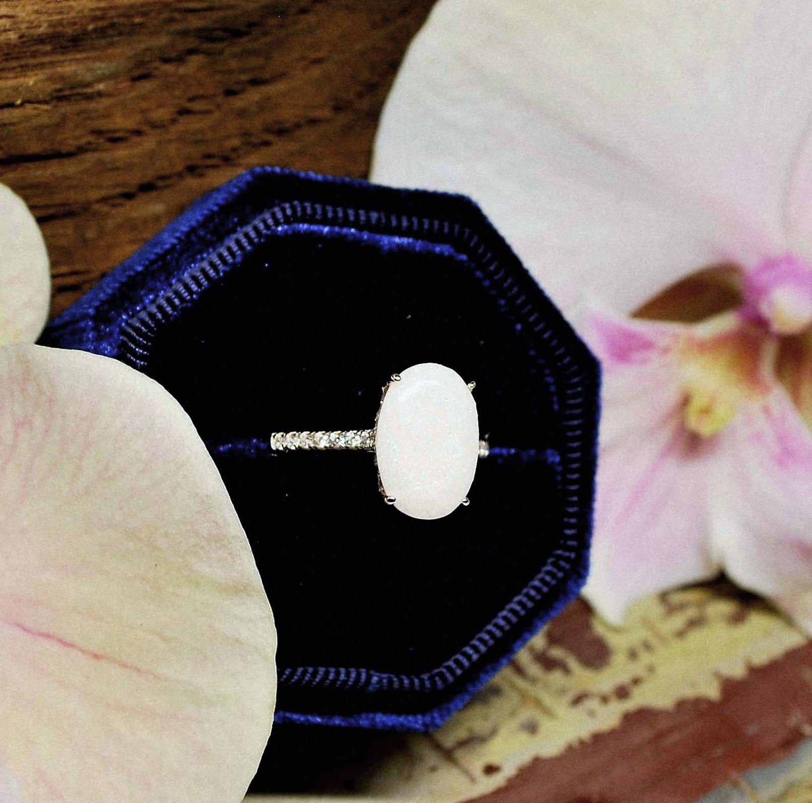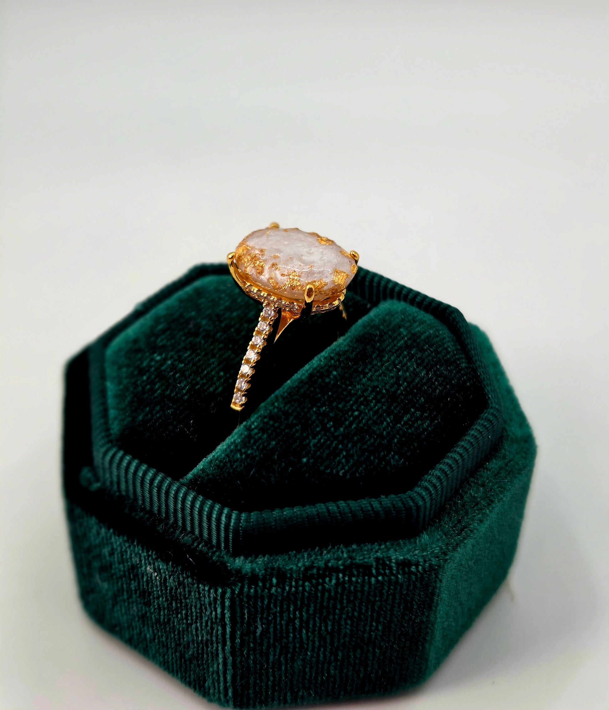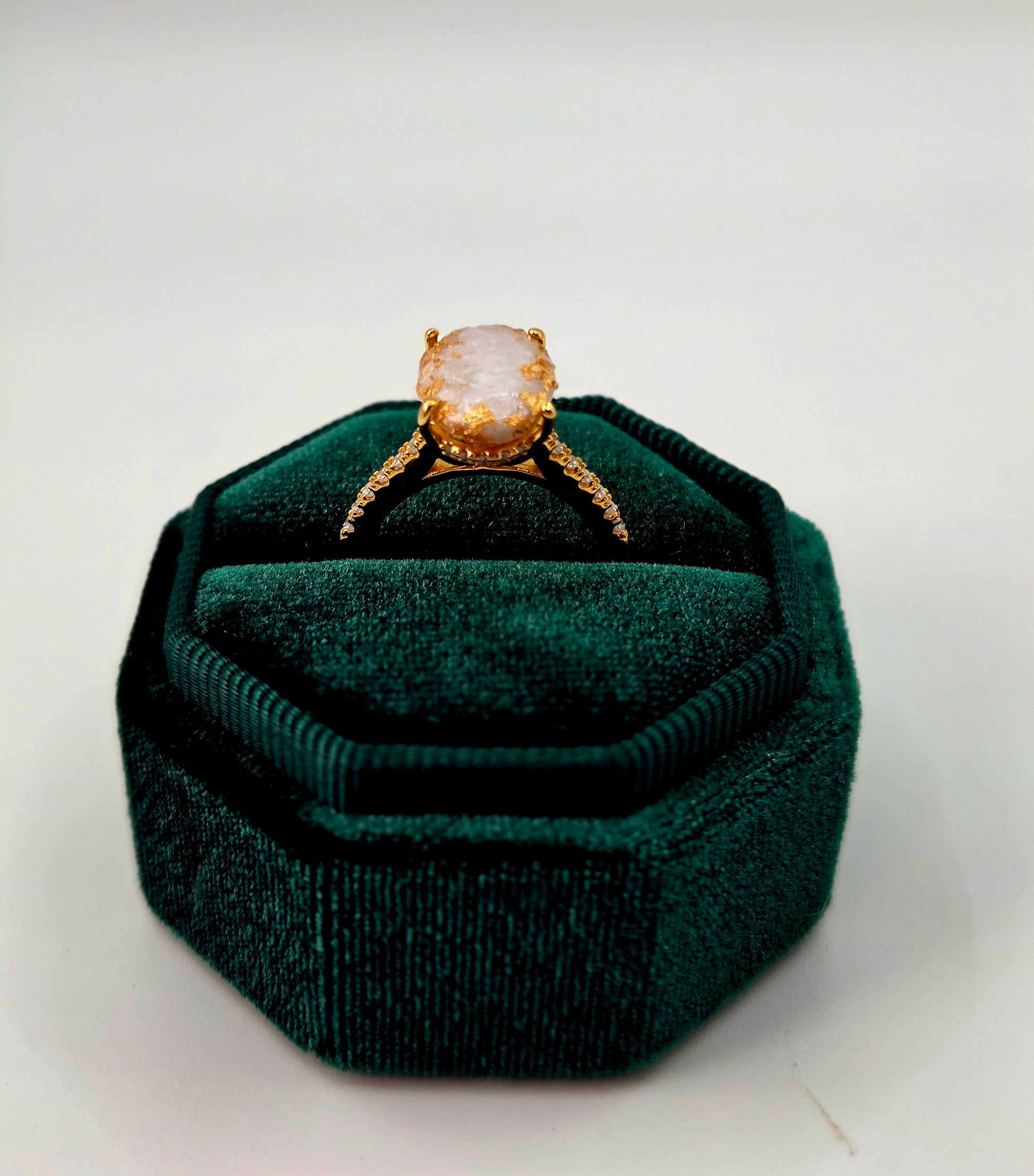 The Hidden Halo Oval features a stunning 9x13mm oval stone centerpiece encircled by a subtle hidden halo of cubic zirconia stones, all set in polished sterling silver, or 14K gold plated. This design enhances brilliance while maintaining an elegant silhouette, offering a sophisticated sparkle without overwhelming the wearer's style.