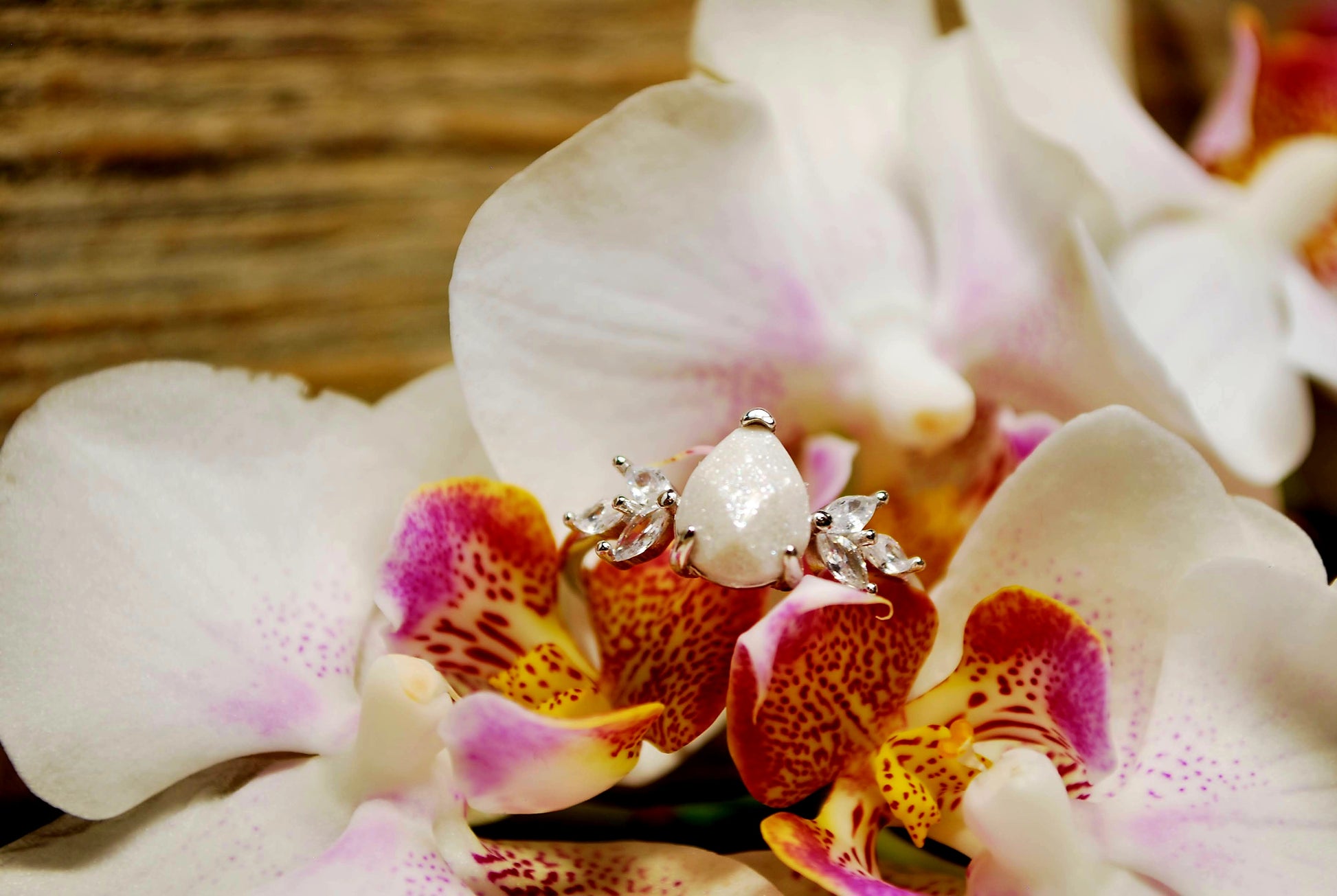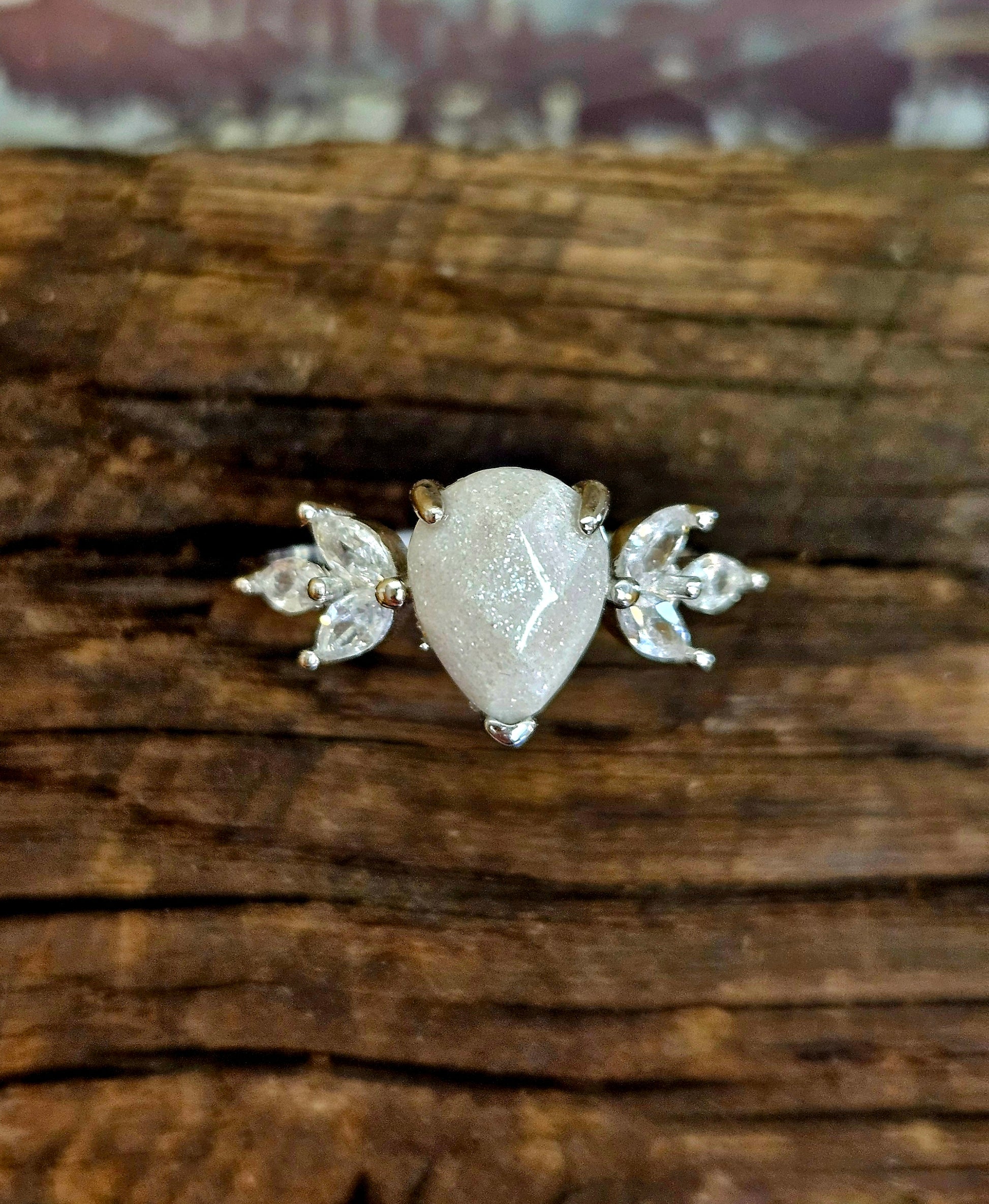 The Ever Upward Ring features a 9x7mm teardrop silhouette crafted from sterling silver. Accented cubic zirconia stones, this piece offers a subtle yet radiant sparkle. Its delicate wing-inspired design evokes grace and the soul ascending. Also available in rose gold plated.